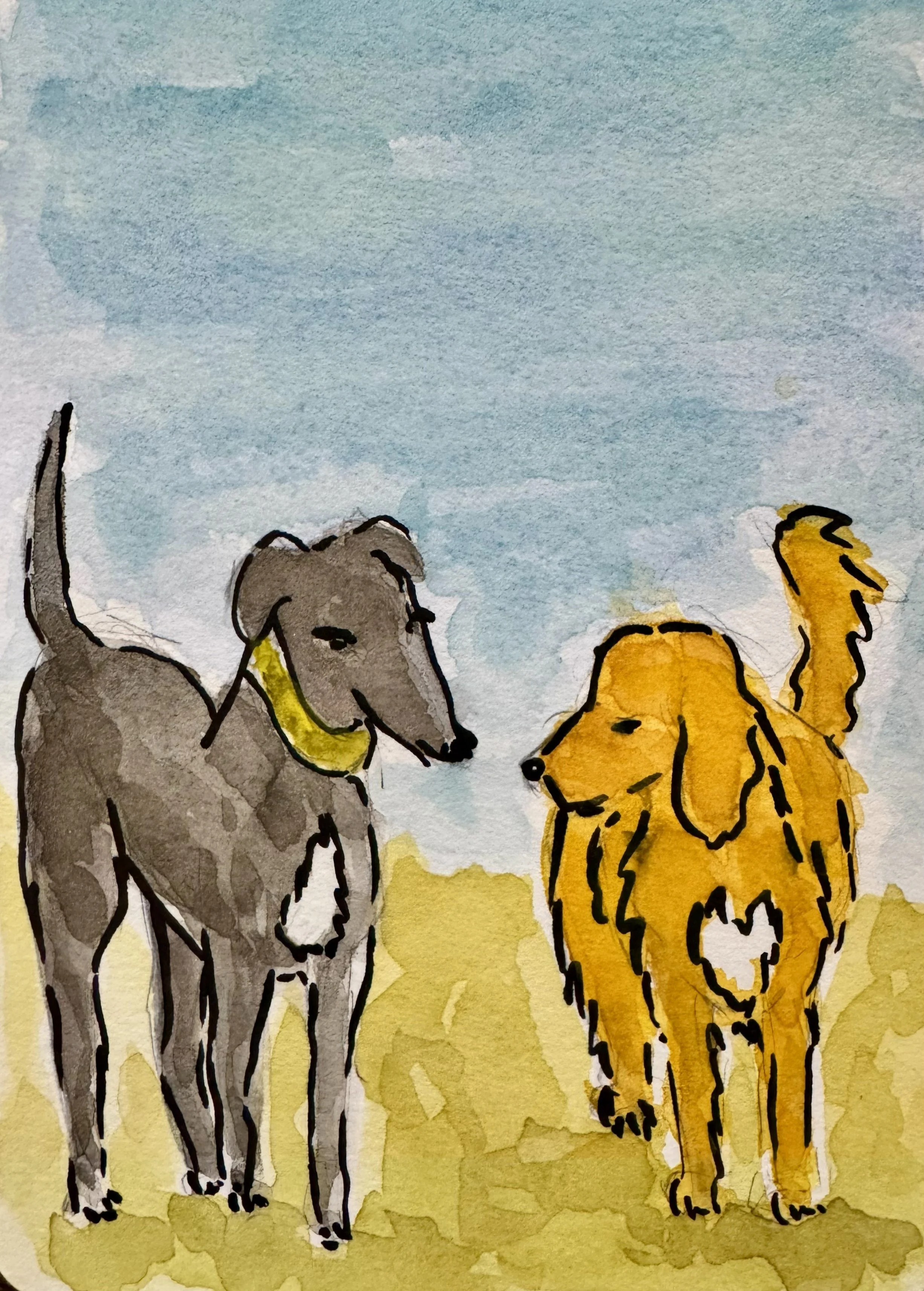 Marshall’s human sister arrived today with Vinny, the Greyhound. I wasn’t sure how well the boys would get along, but there was no problem. They don’t really play, but they are comfortable together and there’s no cranky pants behaviour! Good job boys!!!