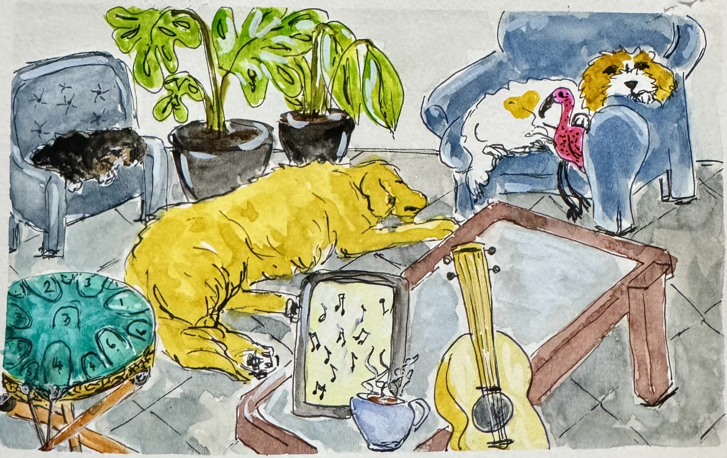 This painting captures the afternoon here today .. it’s a rainy day, the dogs are calm and happy I’m home .. it’s been a slow and gentle day of painting, uking, and lots of pats and love ♥️
