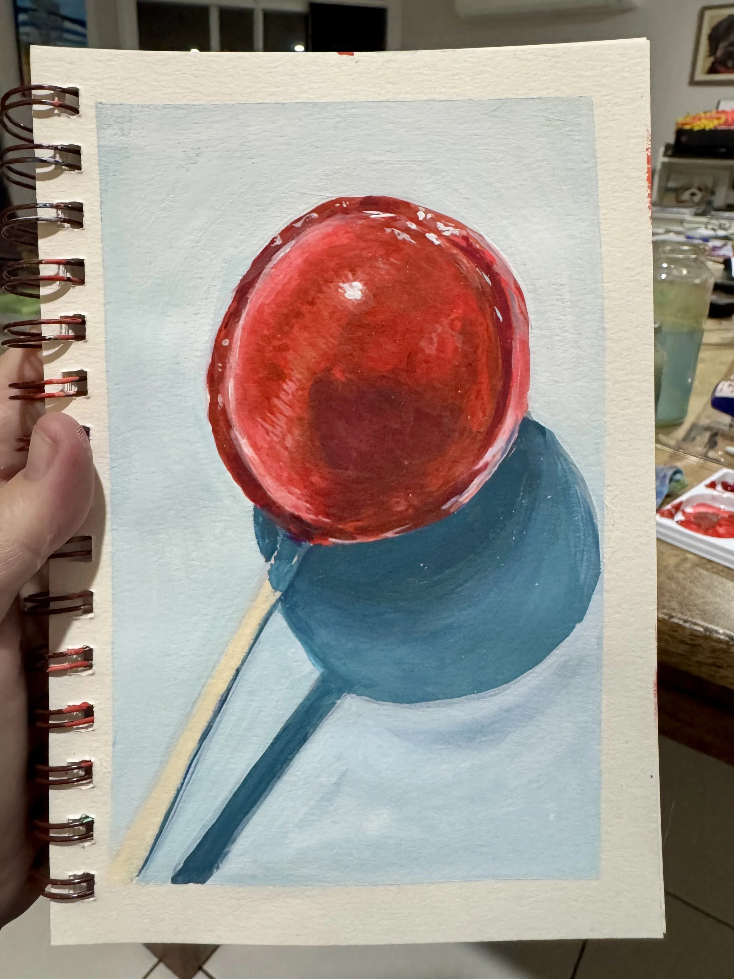 It’s 120 Tuesdays today, which sucks big time. I wanted to have a go at painting this lollipop. It looked deceptively simple so I should have known the risk of stuffing it up was high. I’m still learning about the basics of gouache and I really wasn’t sure how I’d go making a matte, opaque medium look shiny and semi-translucent. There is nowhere to hide in this painting - and yes, I see glaring errors in perspective but I’m also just proud that it looks like a lollipop with a hint of shine :)